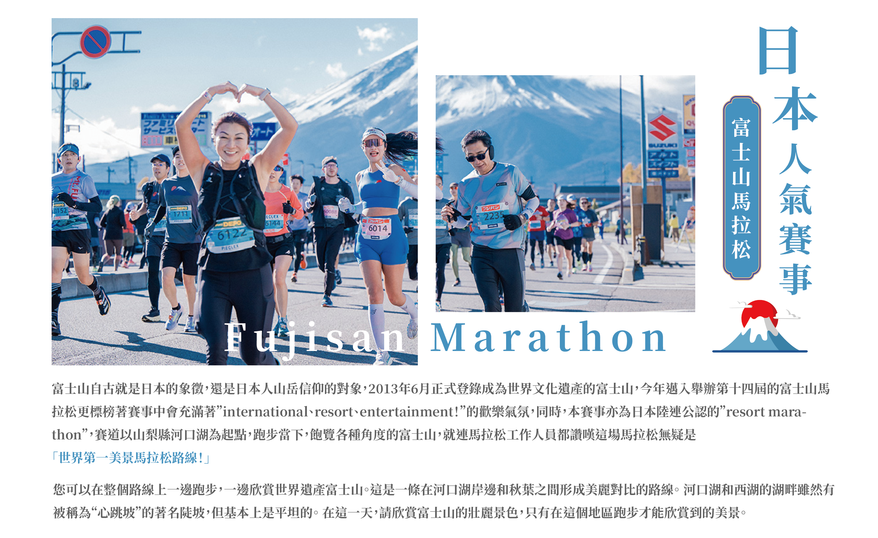 富士山自古就是日本的象徵,還是日本人山岳信仰的對象,2013年6月正式登錄成為世界文化遺產的富士山,今年邁入舉辦第十二屆的富士山馬拉松更標榜著賽事中會充滿著”international、resort、entertainment!”的歡樂氣氛,同時,本賽事亦為日本陸連公認的”resort marathon”,賽道以山梨縣河口湖為起點,跑步當下,飽覽各種角度的富士山,就連馬拉松工作人員都讚嘆這場馬拉松無疑是「世界第一美景馬拉松路線!」