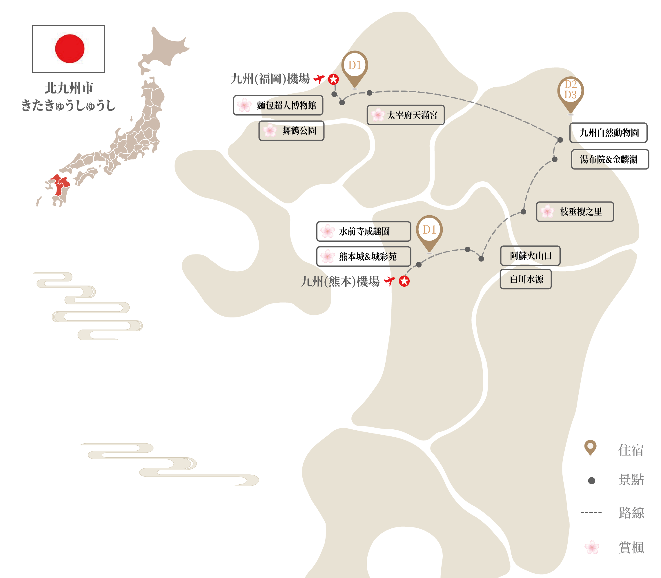 | 航班日期 Day 1 | 航班編號 中華航空 CI 198 | 起飛 高雄小港機場 09:00 | 抵達 九州(熊本)機場 12:25 |