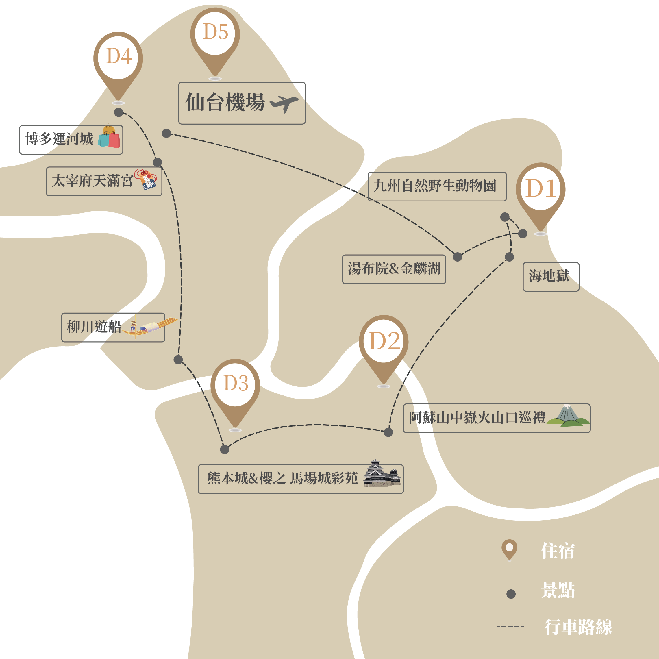 | 航班日期 Day 5 | 航班編號 中華航空 CI 111 | 起飛 九州(福岡)機場 11:00 | 抵達 桃園國際機場 12:30 |